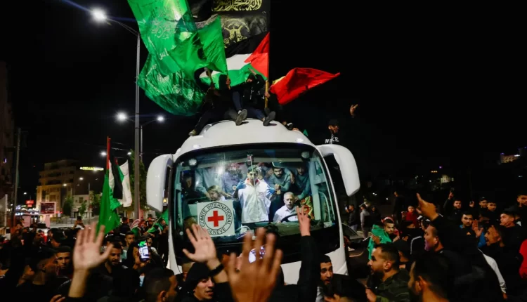 Crowds chanted “God is Great” as the bus arrived, and several young men stood on the roof of the vehicle. Many in the crowd held Hamas flags and chanted pro-Hamas slogans.