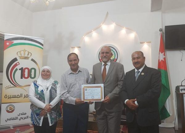 وفي ختام الأمسية قام المهندس صالح الجعافرة رئيس منتدى البيت العربي الثقافي والوزير الأسبق طه الهباهبة بتكريم الشاعر
