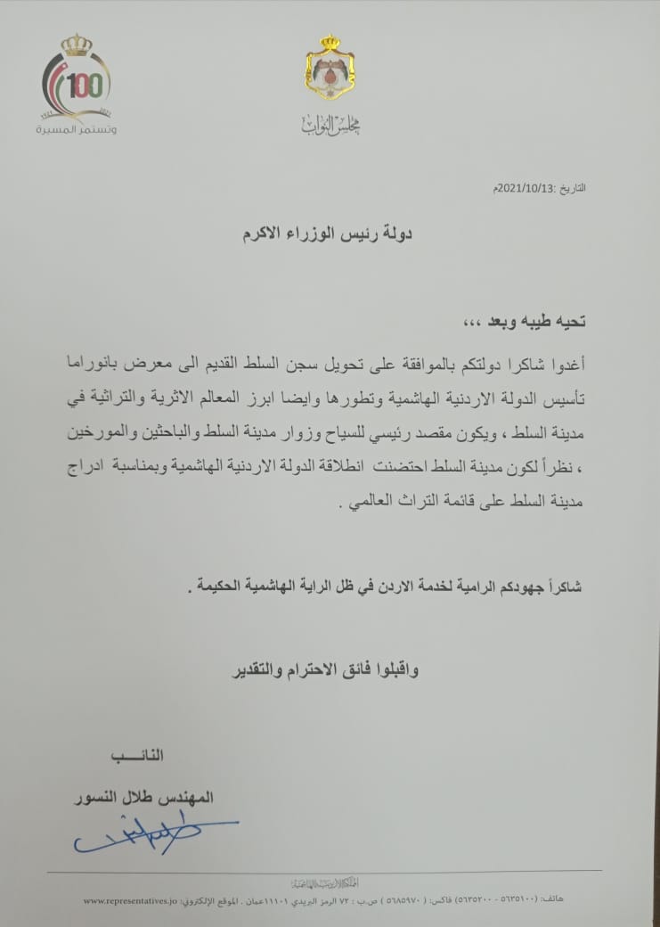 وكالة الناس – طالب النائب المهندس طلال النسور الحكومة بتحويل سجن السلط القديم إلى معرض بانوراما تأسيس الدولة الأردنية الهاشمية وتطورها وإبراز المعالم الاثرية والتراثية في مدينة السلط.