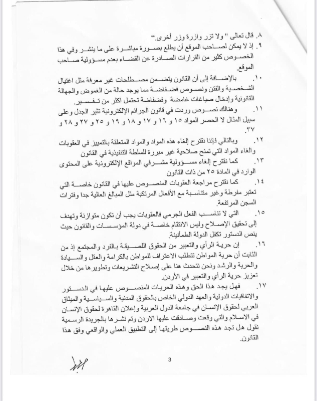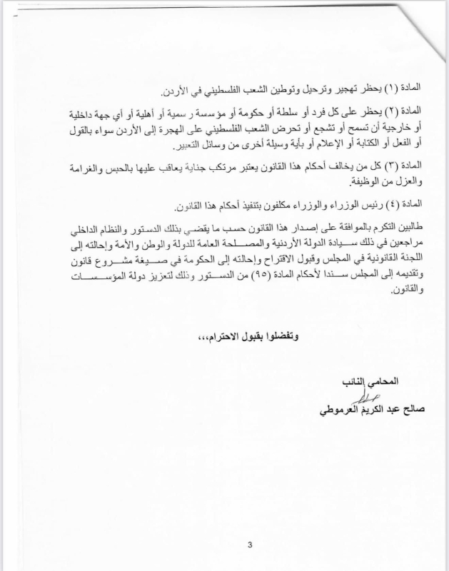 وبحسب ما أعلنته النائبة ديمة طهبوب، تقدمت كتلة نواب جبهة العمل الإسلامي إلى مجلس النواب بمشروع قانون يمنع تهجير الفلسطينيين إلى الأردن، ومشروع آخر لتعديل قانون الجرائم الإلكترونية.
