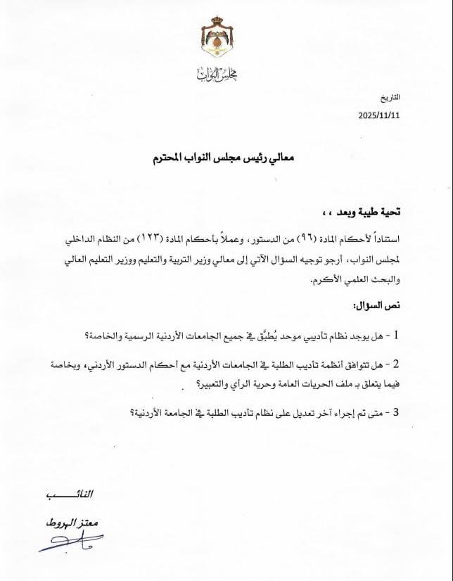 وجّه النائب معتز الهروط سؤالا نيابيا إلى وزير التربية والتعليم العالي والبحث العلمي، طالب فيه بتوضيحات تتعلق بنظام تأديب الطلبة المطبق في الجامعات الأردنية الرسمية والخاصة، ومدى توافقه مع الدستور الأردني ومبادئ الحريات العامة.