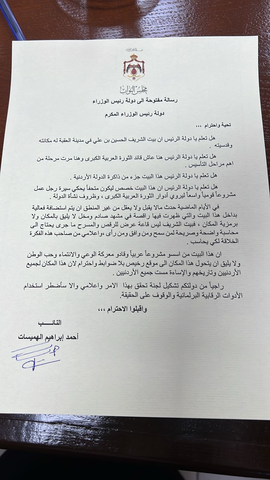 وأضاف في رسالته أن ما جرى داخل البيت يُعدّ “غير منطقي وغير مقبول”، مشيراً إلى أن الفعالية الأخيرة أظهرت المكان بصورة لا تليق به، وأن تحويله إلى قاعة لعرض أنشطة لا تنسجم مع قيم الأردنيين أمر مرفوض.