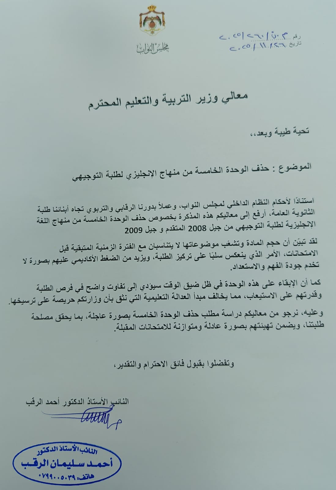وجّه النائب الدكتور أحمد سليمان الرقب مذكرة رسمية إلى معالي وزير التربية والتعليم، طالب فيها بحذف الوحدة الخامسة من مادة اللغة الإنجليزية المقررة على طلبة الثانوية العامة (التوجيهي)، نظراً لعدم انسجام حجم وموضوعات الوحدة مع الوقت المتبقي قبل الامتحانات، وما تسببه من ضغط إضافي يعيق قدرة الطلبة على التركيز والاستعداد الجيد.