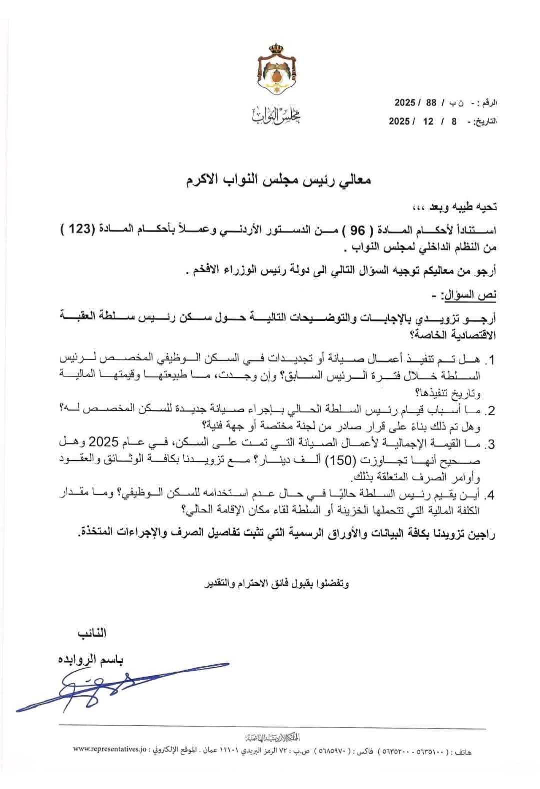 وجه النائب باسم الروابدة سؤالاً نيابياً إلى رئيس الوزراء، يستفسر من خلاله عن أعمال الصيانة التي نفذت في السكن الوظيفي المخصص لرئيس سلطة منطقة العقبة الاقتصادية الخاصة “شادي رمزي المجالي”، متسائلاً عن مدى صحة تجاوز كلفة تلك الأعمال مبلغ 150 ألف دينار خلال عام.