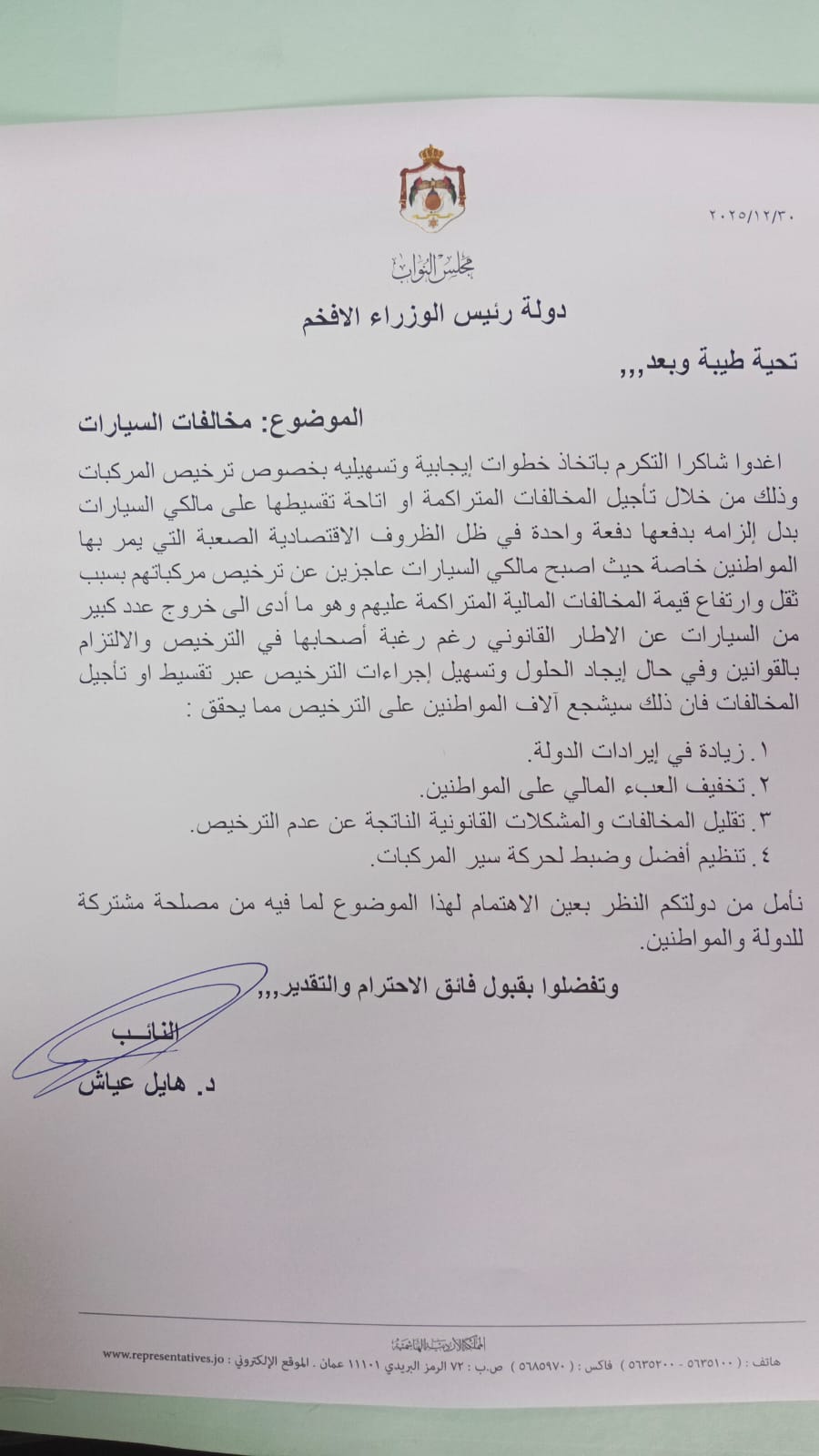 تقدم عضو مجلس النواب، د. هايل عياش، بطلب رسمي إلى دولة رئيس الوزراء، يدعو فيه إلى اتخاذ إجراءات عاجلة لتسهيل عملية ترخيص المركبات على المواطنين، وذلك في ظل الظروف الاقتصادية الصعبة التي يمرون بها.