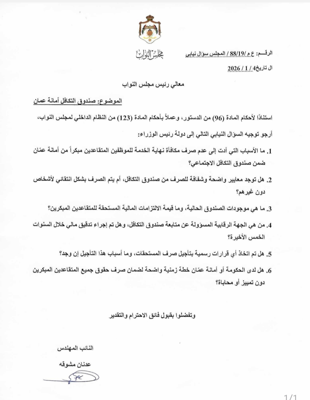 مشوقة يسأل الحكومة عن أسباب تأخر صرف مكافآت نهاية الخدمة لموظفين أمانة عمان