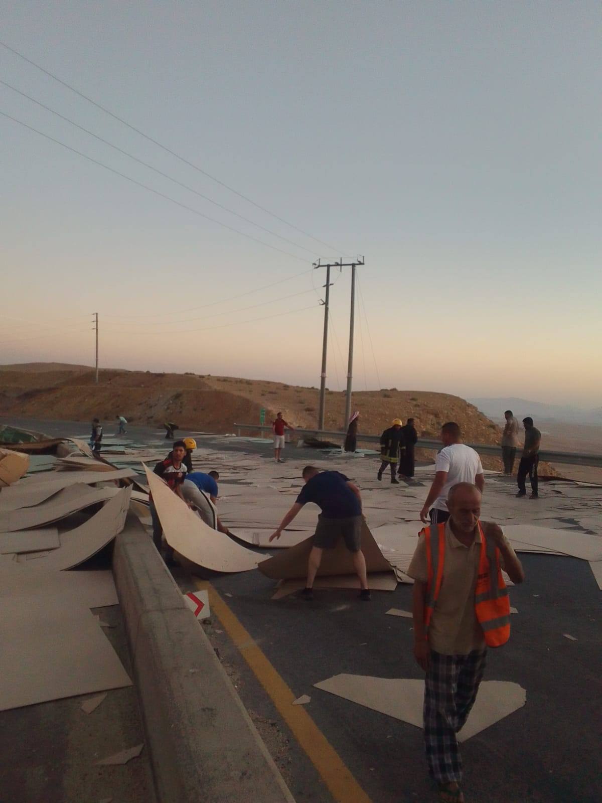 وقد أدى الحادث إلى تناثر الحمولة على المسرب الأيسر باتجاه عمّان، إضافة إلى تطاير أجزاء منها إلى المسرب المقابل باتجاه العقبة، مما تسبب بإغلاق جزئي للطريق وتعطيل جزئي لحركة السير في الموقع.