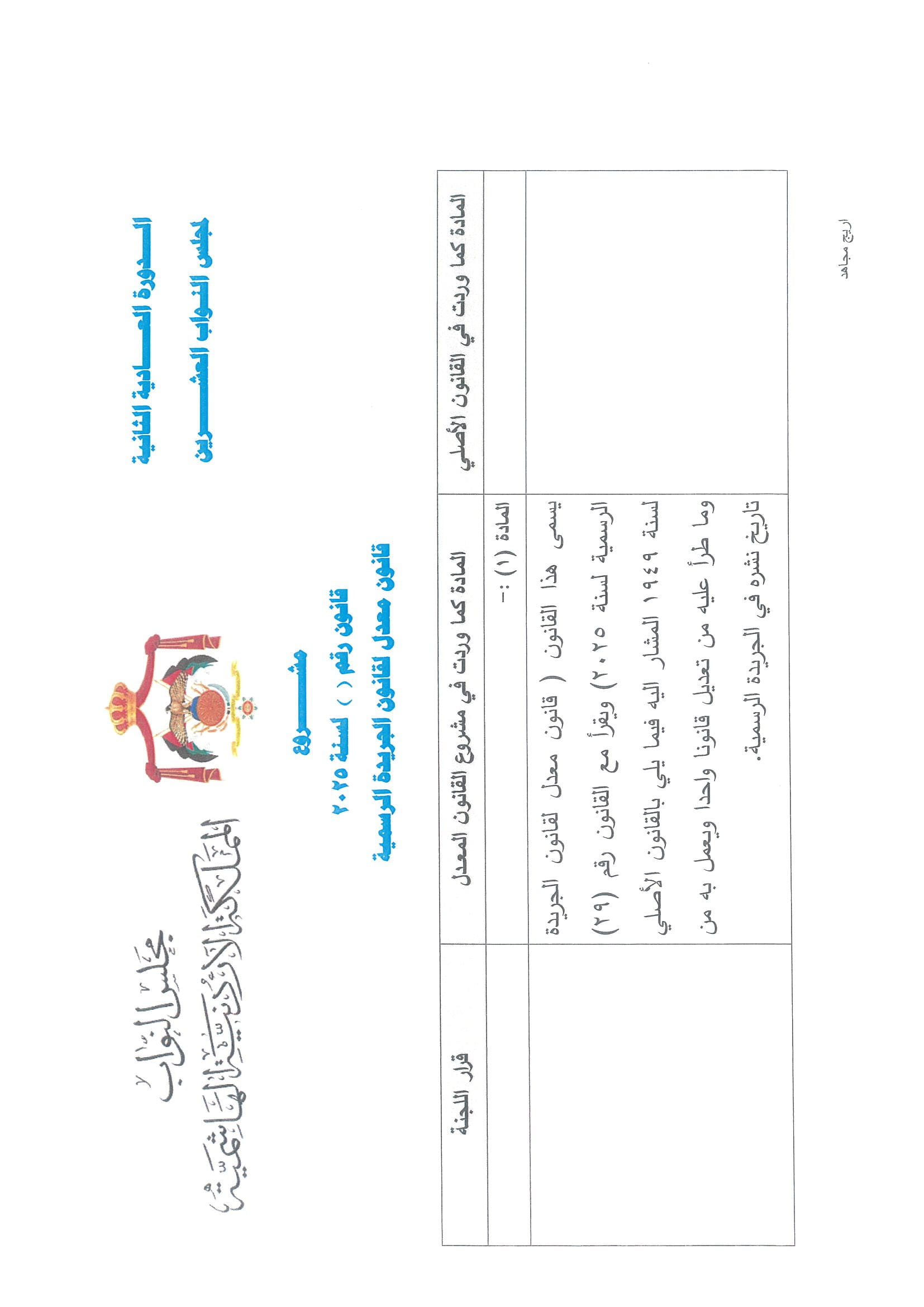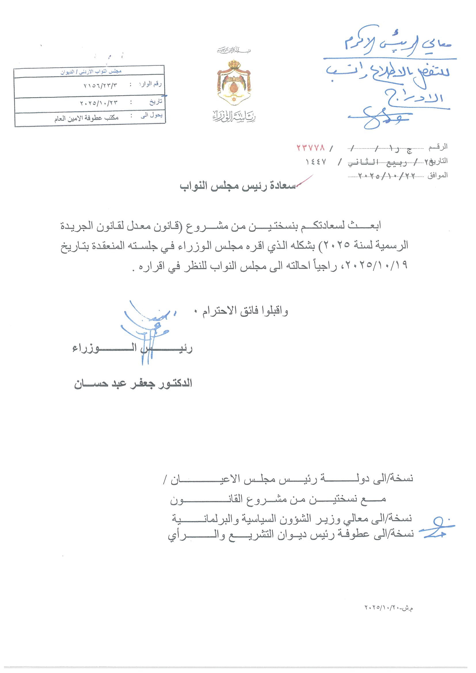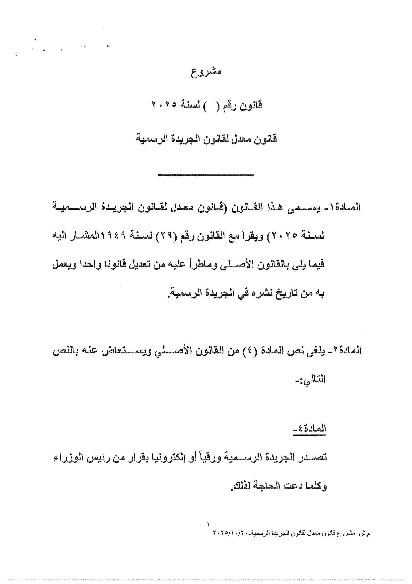 النواب يحيل الجريدة الرسمية إلى لجنة التوجيه الوطني On نوفمبر 17, 2025 Share وكالة الناس – أحال مجلس النواب اليوم الاثنين، مشروع القانون المعدل لقانون الجريدة الرسمية لسنة 2025 إلى لجنة التوجيه الوطني والإعلام. ووافق المجلس على إحالة القانون للجنته المختصة بالاغلبية، لدراسته ووضع المقترحات عليه وإعادته إلى النواب. وتاليا مشروع القانون المعدل كما ورد من الحكومة: