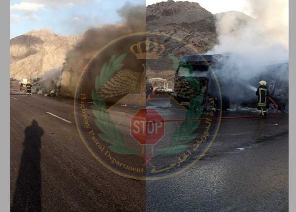 وكالة الناس -قالت إدارة الدوريات الخارجية في مديرية الأمن العام، إن كوادرها تتعامل مع حادث تصادم بين صهريج محمل بغاز مسال ٣١ طن وتريلا محملة بمادة الجبنة على طريق العقبة الخلفي مقابل درك تتن باتجاه عمّان، مما أدى إلى اشتعال المركبتين بالكامل.