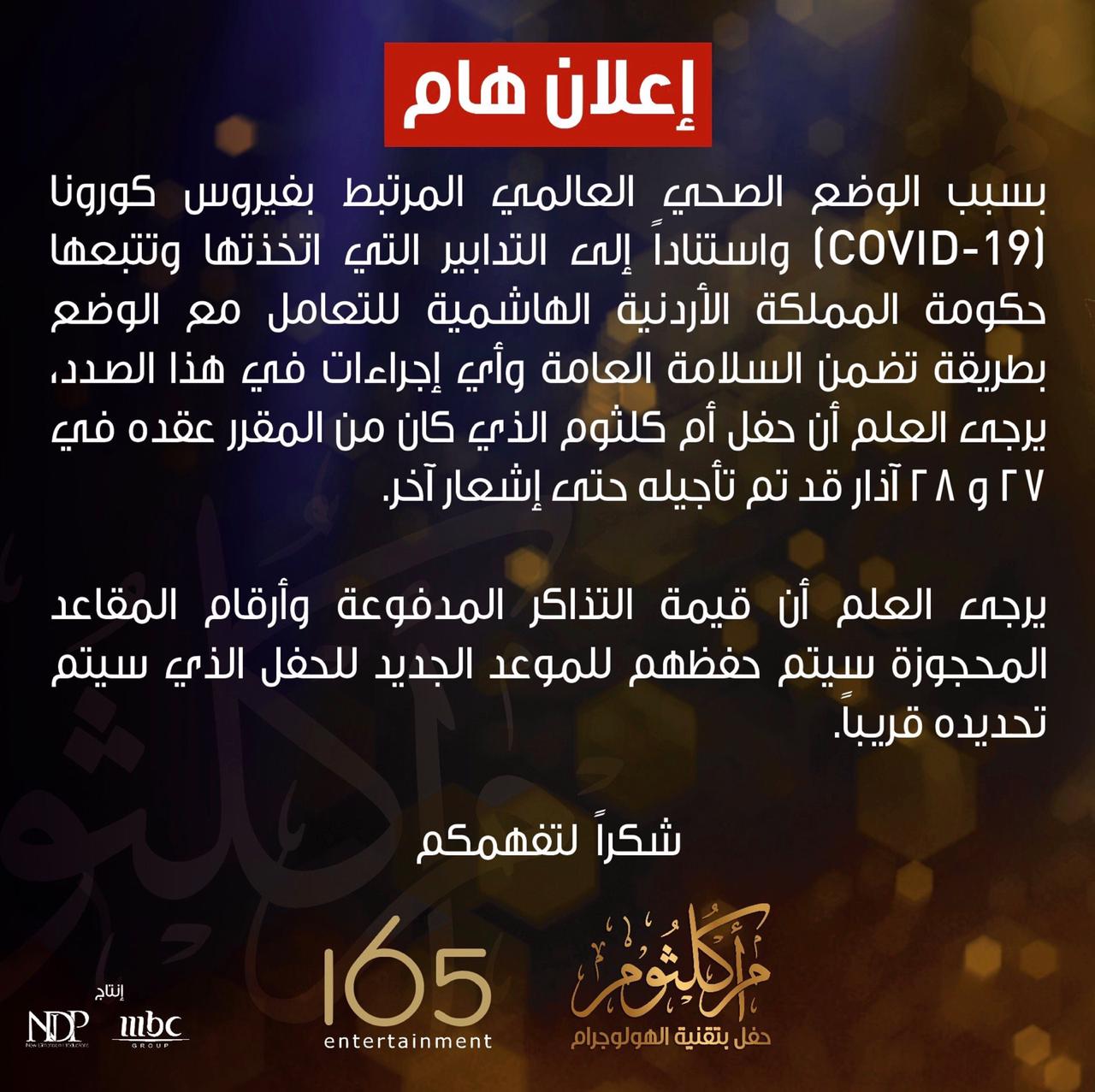 تأجيل حفل ام كلثوم في الأردن Last updated مارس 12, 2020 Share وكالة الناس – أعلنت الجهة المنظمة لحفل ام كلثوم بتقنية الهولوجرام، الخميس، عن تأجيل الحفل المقرر اقامته في العاصمة عمّان في 27 و28 اذار حتى اشعار اخر.وقالت الجهة المنظمة، في بيان لها، إن قرار التأجيل يأتي في اطار التدابير الصحية المتخذة من قبل الحكومة الأردنية لمواجهة فيروس كورونا.وذكرت، أنه سيتم حفظ التذاكر المدفوعة الى الموعد الجديد للحفل.