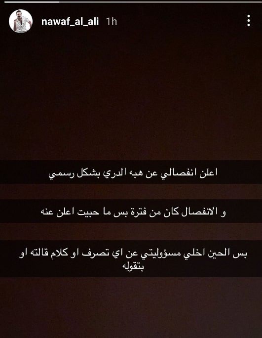وتصدرت كلمات نواف العلي عناوين رواد السوشيال ميديا، في الوقت الذي لم تُشر فيه هبة الدري بشكل رسمي إلى الطلاق، أو تعلق على ما قاله نواف الذي تنصل من أي مسؤولية تقع على عاتقه تجاه طليقته وفق المتابعين، مشيرين إلى أنه ليس من الرجولة أن يُخلي مسؤوليته عن أي تصرف أو كلام قالته أو تقوله أم أبنائه.