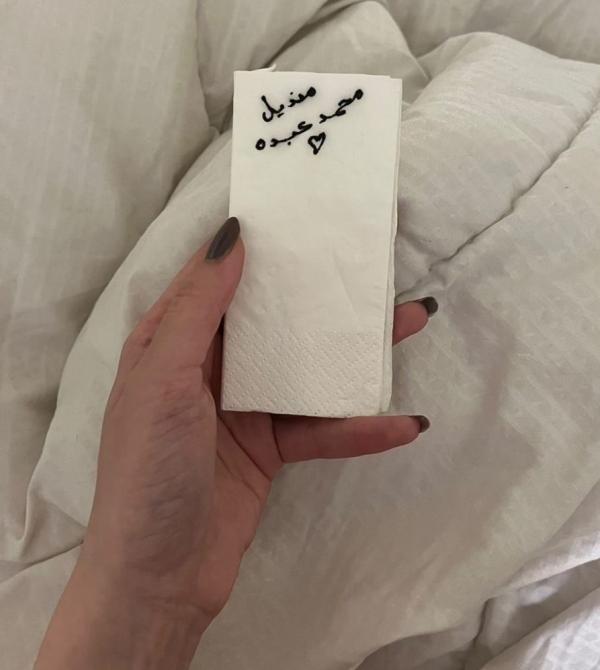 ويظهر في الصورة منديل ورقي أبيض مطوي بطريقة مثالية وكأنه لم يستخدم مسبقًا، وكتب عليه باللون الأسود “منديل محمد عبده”.