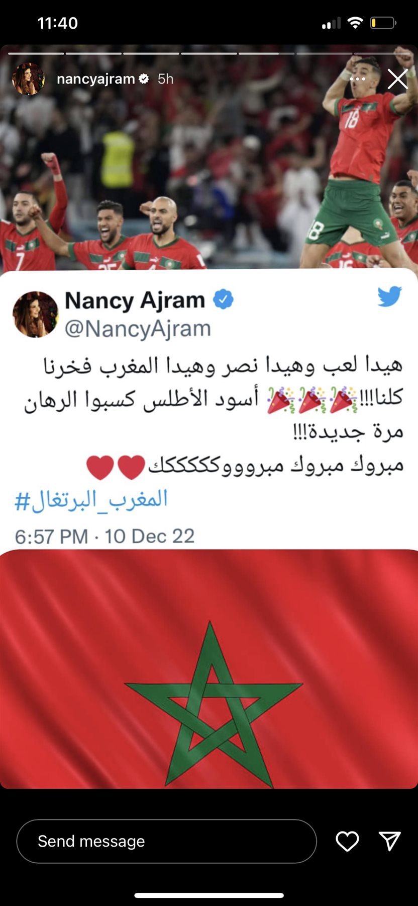 وكالة الناس – نشرت الفنانة نانسي عجرم “أستوري” عبر حسابها الشخصي بموقع تبادل الصور والفيديوهات ” إنستجرام ”، تعبر عن سعادتها بتأهل المغرب للربع النهائي من كأس العالم.