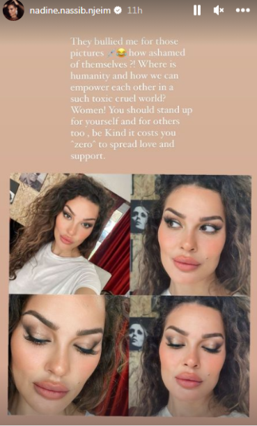 ومن خلال خاصية “ستوري” عبر حسابها الخاص بـ “إنستغرام” ردت الفنانة اللبنانية نادين نجيم بنشر مجموعة من الصور معلقة: “يتنمرون على بسبب تلك الصور، ألا يخجلون من أنفسهم أين هي الإنسانية؟ وكيف يمكننا دعم بعضنا البعض في مثل هذا العالم السام والقاسي؟ للنساء عليكن الدفاع عن أنفسكن وعن بعضكن البعض.. كن لطيفًا لا يكلفك أي شئ أن تنشر الحب والدعم”.