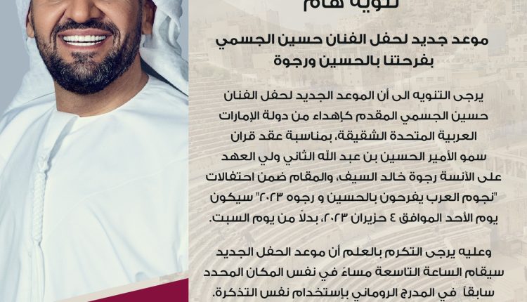 تأجيل حفل حسين الجسمي ليوم الاحد بدلا من السبت