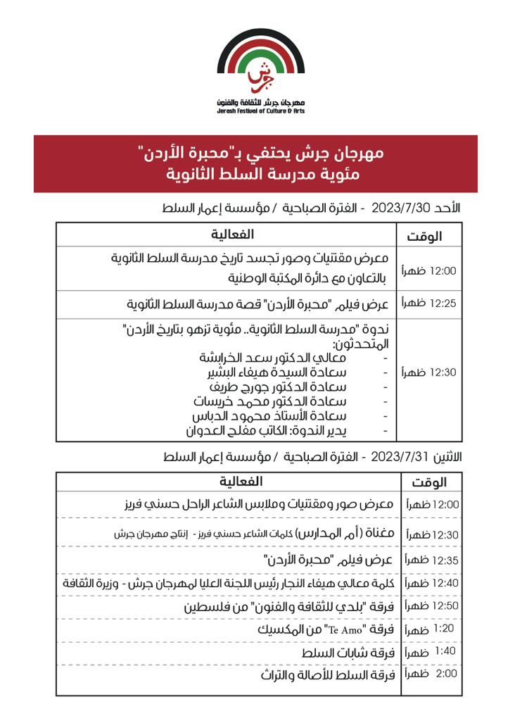 مهرجان جرش يحتفي بـ “محبرة الاردن” مئوية مدرسة السلط الثانوية