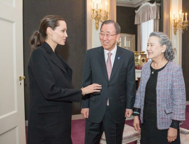 أنجلينا جولي وبان كي مون وزوجتهقامت أنجلينا بالتوجه بزيارة خاصة في مقر الأمم المتحدة، للأمين العام للأمم المتحدة بان كي مون وزوجته، وبدت بحالة جيدة على عكس الأخبار التي انتشرت الفترة السابقة.