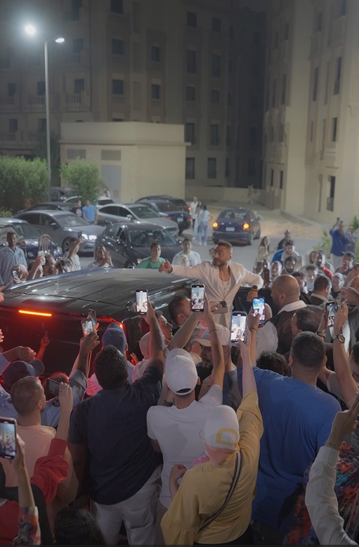 الجمهور يوقف سيارة تامر حسني في التجمع الخامس.. والفنان يلتقط الصور رفقته  قبل إحدى الحفلات