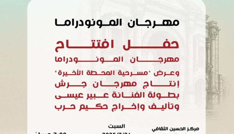 وكالة الناس -ضمن فعاليات مهرجان جرش للثقافة والفنون في دورته التاسعة والثلاثين، ينطلق برنامج “المونودراما المسرحي” بعرض افتتاحي مميز بعنوان “المحطة الأخيرة”، تؤديه الفنانة القديرة عبير عيسى، وهو من تأليف وإخراج حكيم حرب.