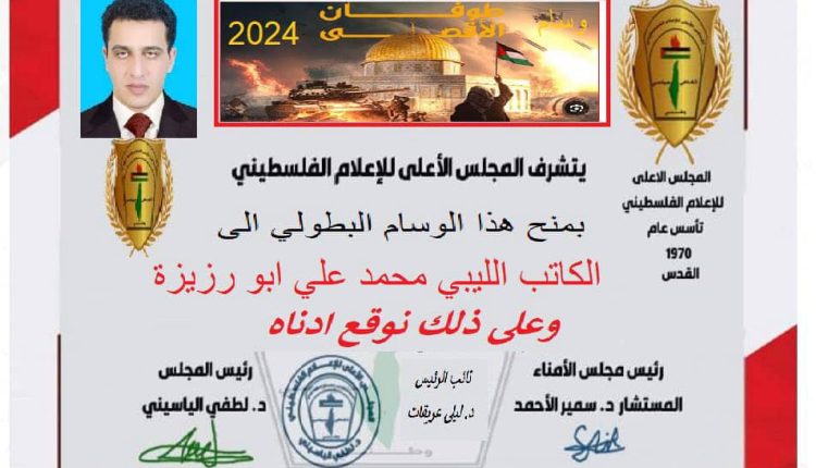 ” المجلس الأعلى للأعلام الفلسطيني يمنح الكاتب الليبي محمد علي أبورزيزة وسام طوفان الأقصى “