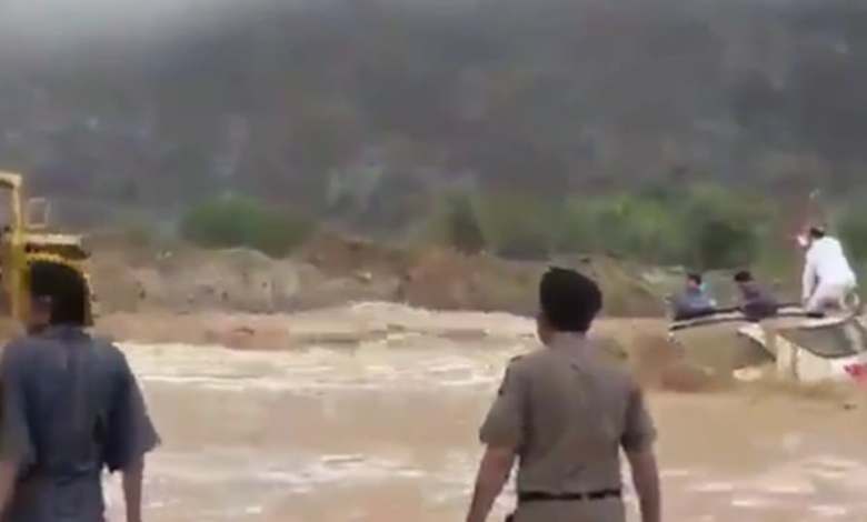 في التفاصيل، يوضح الفيديو 3 أشخاص عالقين فوق سقف سيارة علقت وسط سيل جارف، فيما تجمع آخرون عند ضفة السيل عاجزين عن إنقاذهم.