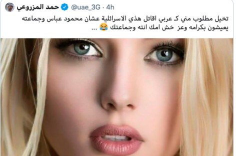 أما الناشط حمد المزروعي فقد نشر صورة لفتاة إسرائيلية على حسابه على توتير، وكتب «تخيل مطلوب مني كعربي أقاتل هذي الإسرائيلية عشان محمود عباس وجماعته يعيشون بكرامه وعز». التغريدة حصدت كما هائلا من الانتقادات على مواقع التواصل.