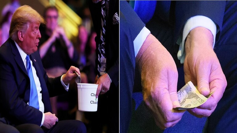 رصدت الكاميرات الرئيس الأمريكي دونالد ترامب خلال تبرعه بمبلغ من المال أثناء زيارته للكنيسة الدولية في لاس فيغاس، يوم الأحد، وخلال ظهوره الثالث في الكنيسة، سحب ترامب ما بدا أنه حوالي 8 ورقات نقدية قيمة الواحدة منها 20 دولارا، من جيب بنطاله عندما تم تمرير صندوق جمع التبرعات.