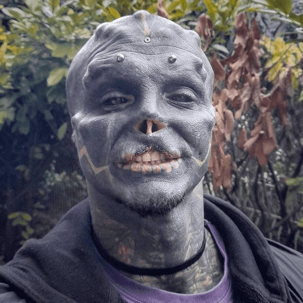 وبحسب صحيفة “ميرور”، يكافح الشاب لجعل نفسه أشبه بكائن فضائي، حيث قام بتعديلات كبيرة على شكل وجهه، بما في ذلك مقلتا عينيه، وغطى نفسه بالوشم ليبدو كأنه كائن أسود من خارج كوكب الأرض.