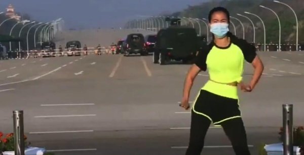 A woman did her regular aerobics class out in open without realizing that a coup was taking place in #Myanmar. A Military convoy reaching the parliament can be seen behind the woman as she performs aerobics. Incredible! pic.twitter.com/gRnQkMshDe
