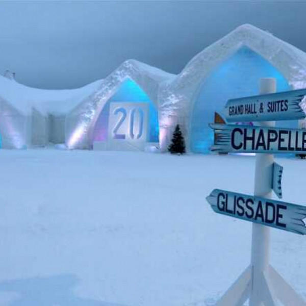 ويعتبر هو الفندق الوحيد من نوعه في أمريكا الشمالية، ويشتمل هذا العام على قاعة كبيرة وكنيسة حيث يمكن للثنائيات عقد زفافهما، و15 جناحًا خاصًا وست غرف وبار جليدي، ويقع الفندق فى مقاطعة كيبيك الكندية.