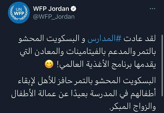 ونشرت صفحة البرنامج في الأردن تغريدة لها قال فيها: لقد عادت المدارس والبسكويت المحشو بالتمر والمدعم بالفيتامينات والمعادن التي يقدمها برنامج الأغذية العالمي.