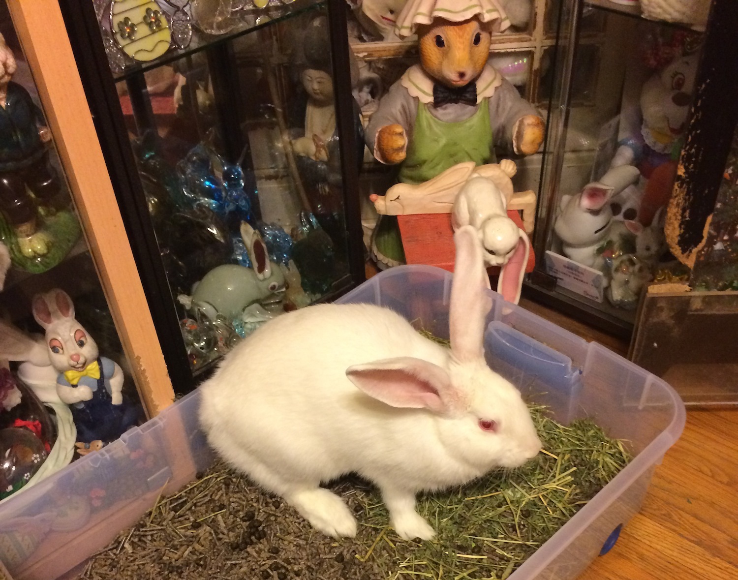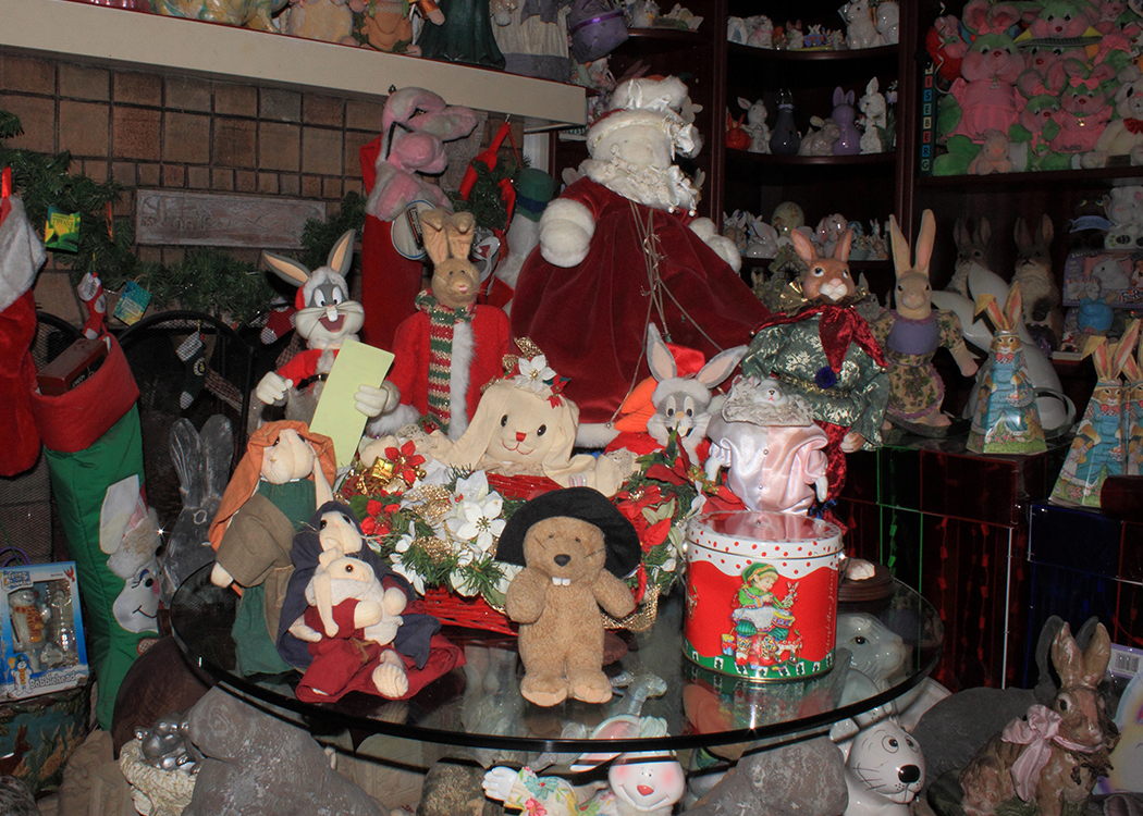 بالإضافة الى القطع الفنية المرتبطة بالأرانب، وعوامات Rose Parade التي تحمل طابع الأرانب، وتماثيل الأرانب بأحجام مختلفة، بما فيها أرنبة مع “دو” الشهير لإلفيس بريسلي، ولا ننسى أيضاً الأرانب الحيّة التي دُرّبَت داخل المنزل.