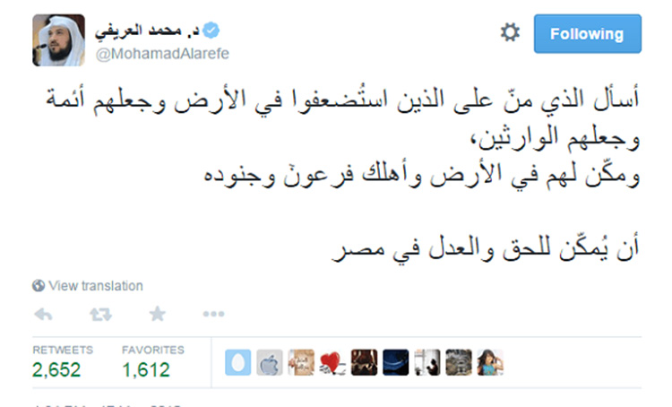 و كتب “العريفي” في تغريدة سابقة : “في مصر علماؤنا وقراؤنا وأطباؤنا ومدرّسونا وأصدقاء وأصحاب وأحباب…اللهم احفظ مصر وأهلها من الحروب الأهلية والخلافات وأمّنهم وارزقهم”.