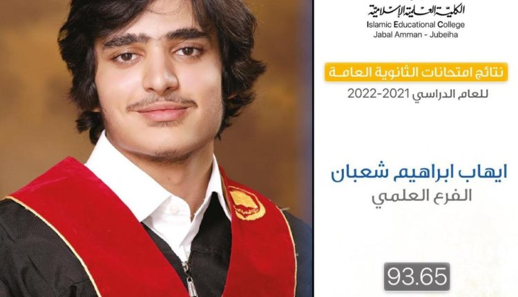 وكالة الناس – يتقدم الاستاذ المحامي ابراهيم شعبان – عضو مجلس أمناء جامعة عمان الاهلية – وكافة أفراد عائلته من ابنهم البار ايهاب بأحر التهاني والتبريكات بمناسبة نجاحه وبتفوق لافت في امتحان الثانوية العامة للعام الدراسي 2021-2022 – الفرع العلمي –  بمعدل (93.65).