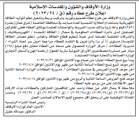 مطلوب توليد الطاقة الكهربائية بأستخدام الخلايا الشمسية لوزارة الاوقاف On يوليو 31, 2023 Share وكالة الناس – مطلوب توليد الطاقة الكهربائية بأستخدام الخلايا الشمسية لوزارة الاوقاف