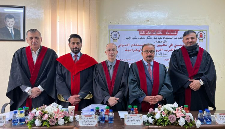 من جامعة مؤتة بتقدير امتياز، عن أطروحته المتميزة بعنوان: “الدور الروسي في تغيير بنية النظام الدولي في ضوء الحرب الروسية الأوكرانية”، والتي أُجيزت من لجنة علمية مشكّلة من نخبة من الأساتذة المتخصصين.