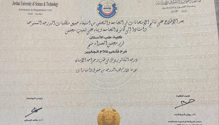وكالة الناس -تتقدم اسرة “وكالة الناس” الاخبارية بأسمى آيات التهنئة والتبريك لرئيس غرفتي صناعة عمّان والأردن فتحي الجغبير، بمناسبة تخرج ابنته فرح من جامعة العلوم والتكنولوجيا الأردنية، وحصولها على درجة البكالوريوس في طب وجراحة الأسنان.