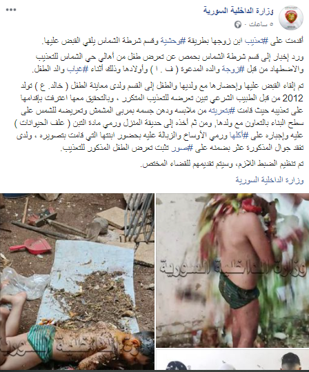 وقالت الوزارة عبر صفحتها على الفيس بوك إنه ورد إخبار إلى قسم شرطة الشماس بحمص عن تعرض طفل من أهالي حي الشماس للتعذيب والاضطهاد من قبل زوجة والده المدعوة ( ف . ا ) وأولادها وذلك أثناء غياب والد الطفل.