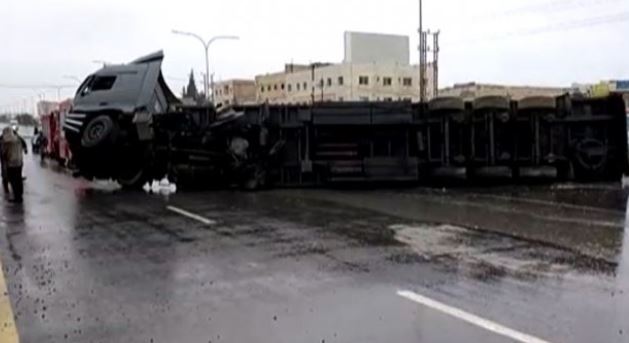 وقال شهود عيان أن الحادث كان نتيجة فقدان السائق السيطرة على الشاحنة، ما أدى إلى انقلابها على المسرب الآخر وأغلقت الطريق.