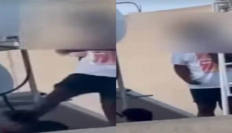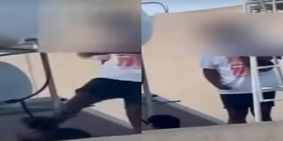 يُظهر أجنبيًا يلكم ويركل لاجئ  في رأسه أثناء وجوده على سطح مبنى سكني.