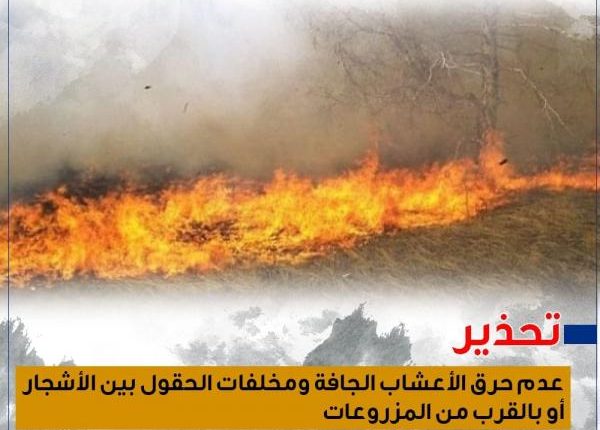 ودعا الدفاع المدني إلى عدم حرق الأعشاب الجافة ومخلفات الحقول بين الأشجار أو بالقرب من المزروعات.