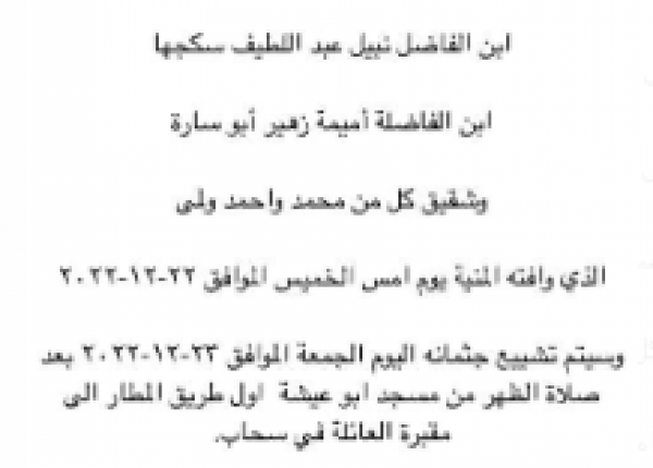 وشقيق كل من محمد واحمد ولمى الذي وافته المنية امس الخميس الموافق 22-2-2022.