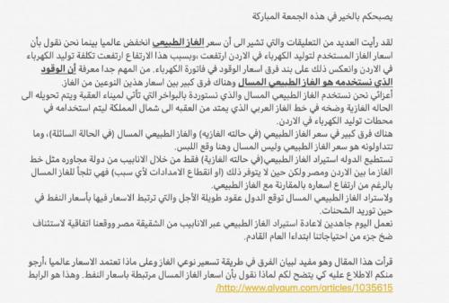 ونشرت زواتي صورة عبر حسابها الرسمي على ‘تويتر’ ردا على استفسارات المواطنين حول موضوع انخفاض أسعار الغاز الطبيعي عالميا، وارتفاع أسعار الكهرباء في الأردن، ووضع بند جديد عبر فاتورة الكهرباء يسمى فرق أسعار الوقود.