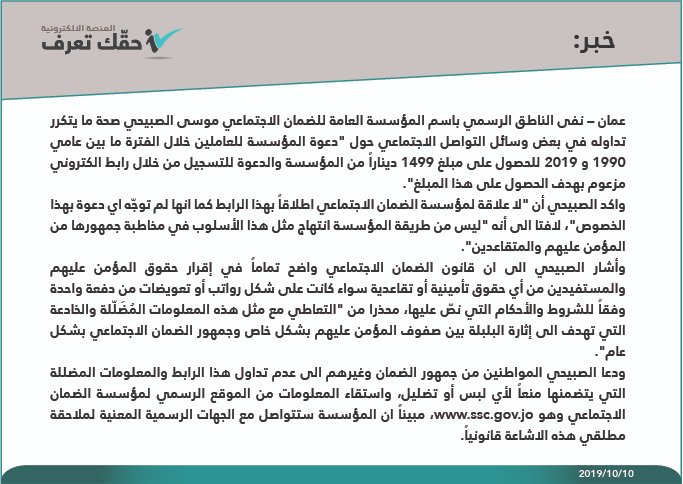 ودعا الصبيحي المواطنين من جمهور الضمان وغيرهم الى عدم تداول هذا الرابط والمعلومات المضللة التي يتضمنها منعاً لأي لبس أو تضليل، واستقاء المعلومات من الموقع الرسمي لمؤسسة الضمان الاجتماعي وهو (http://www.ssc.gov.jo)، مبيناً ان المؤسسة ستتواصل مع الجهات الرسمية المعنية لملاحقة مطلقي هذه الاشاعة قانونياً.