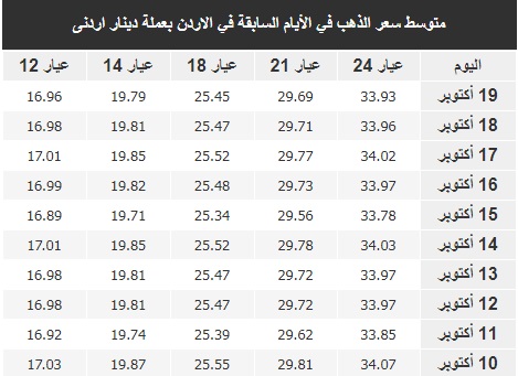 وتحتوي أيضا علي مخطط بمعدل الارتفاع والانخفاض في اسعار الذهب اليوم في الاردن في الأيام السابقة في السوق الأردني.