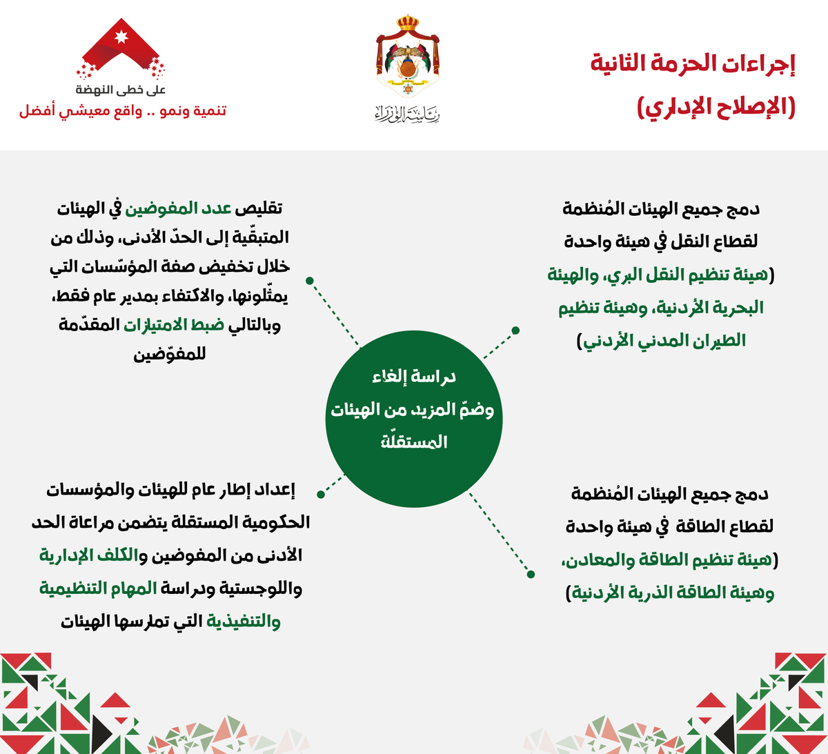 وكالة الناس الحزمة التنفيذية الثانية للبرنامج الاقتصادي الحكومي؛ هي حزمة تحفيزية جديدة، بما فيها من قرارات وإجراءات مدروسة، ستنهض بواقع مختلف القطاعات، وأضاف ان الحزمة ستزيل في جانب الاصلاح الإداري العديد من التشوهات والمعيقات البيروقراطية، وبما ينعكس على الخدمات المقدمة للمواطن، الذي هو على رأس أولويات جلالة الملك حفظه الله وفي صلب توجيهاته للحكومة.