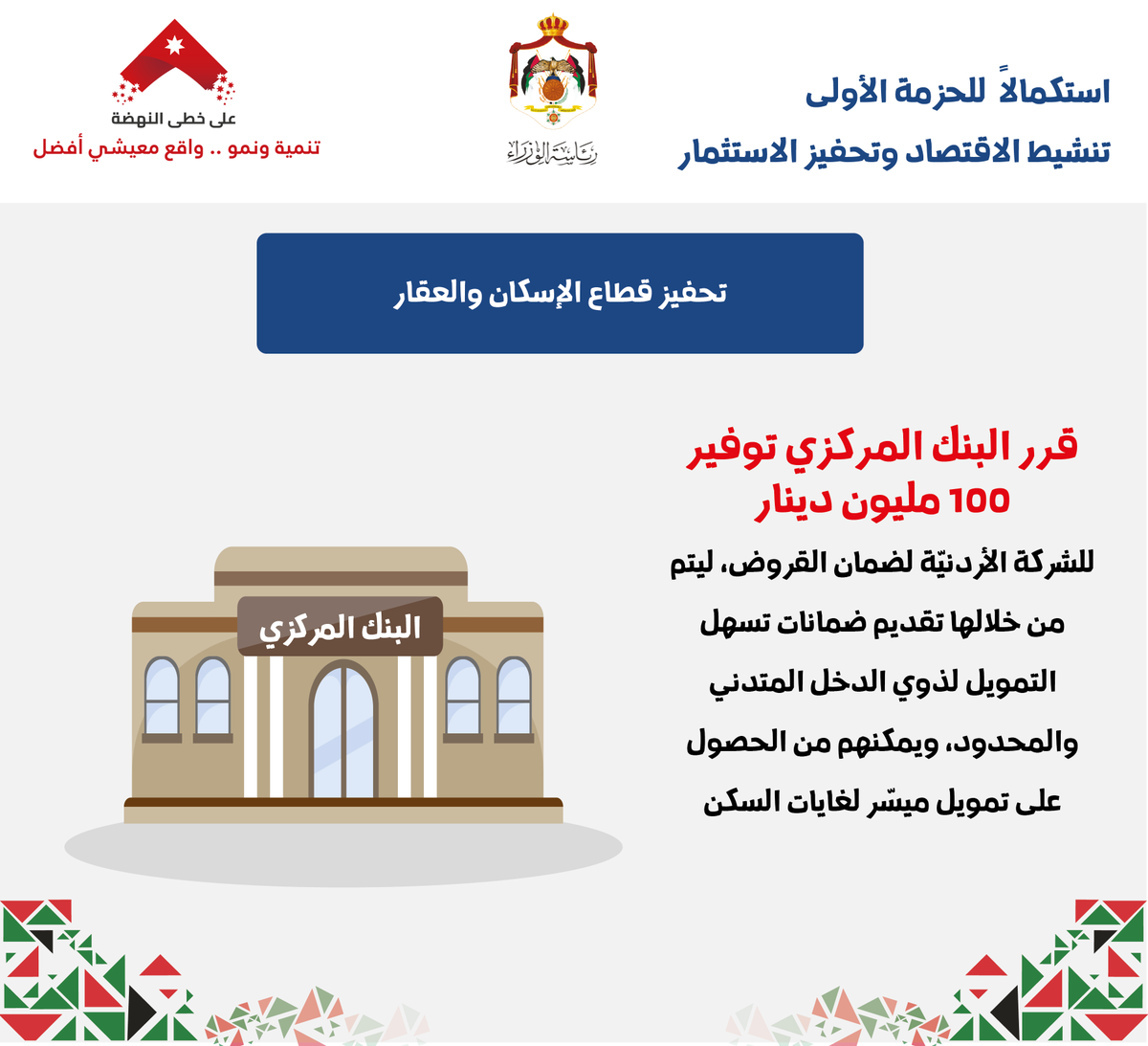 – قرر البنك المركزي توفير 100 مليون دينار للشركة الأردنية لضمان القروض ليتم من خلالها تقديم ضمانات تسهل التمويل لذوي الدخل المتدني والمحدود، ويمكنهم من الحصول على تمويل ميسر لغايات السكن.