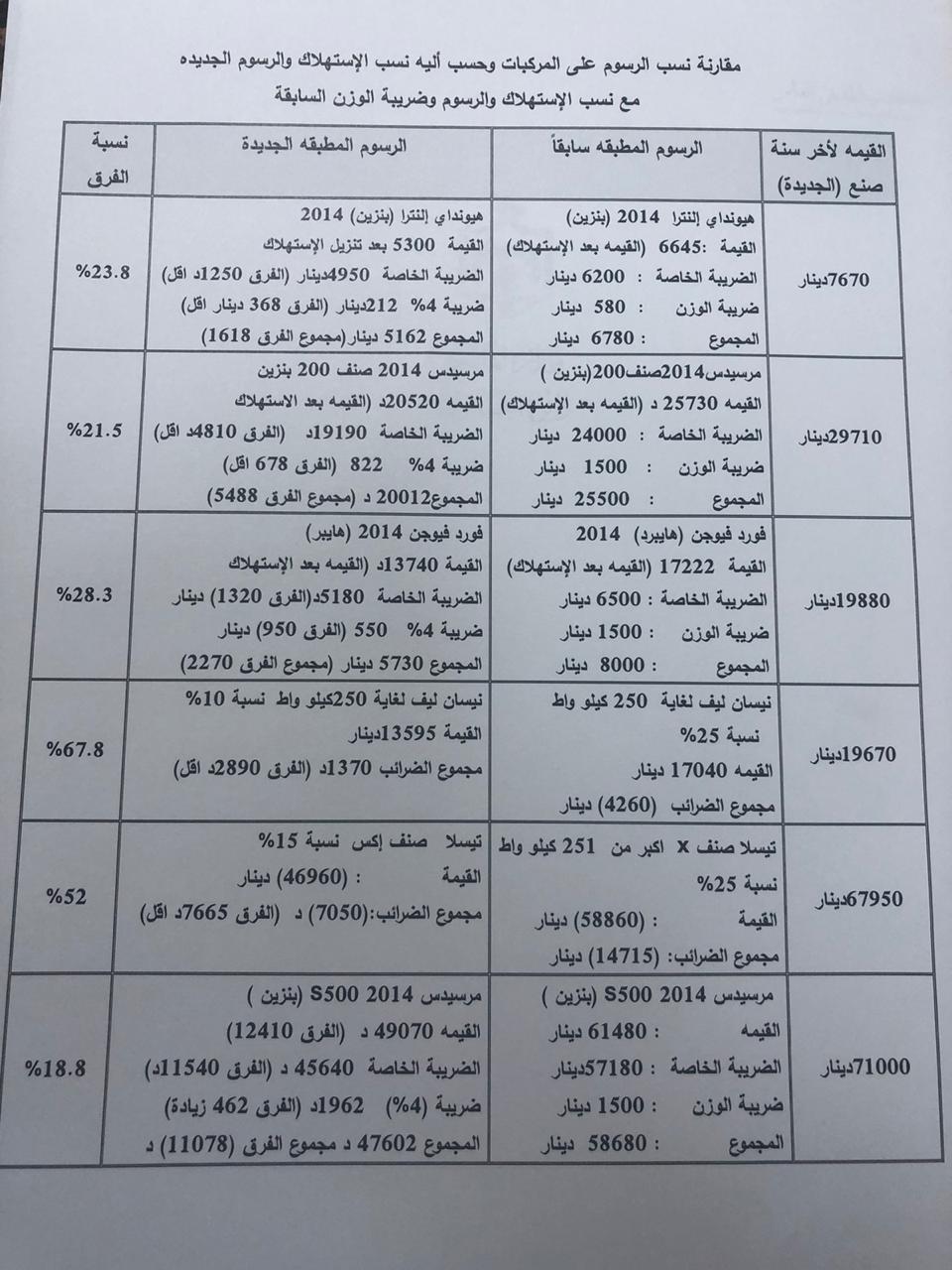 وكالة الناس – يظهر الجدول التالي المبين في الصورة مقارنة نسب الرسوم على المركبات وحسب آلية نسب الاستهلاك والرسوم الجديدة مع نسب الاستهلاك والرسوم وضريبة الوزن السابقة.
