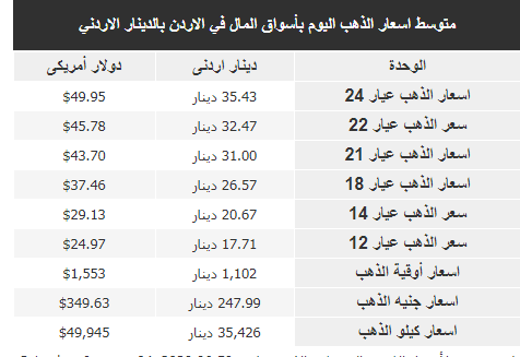 ارتفاع اسعار الذهب السبت 4-1-2020 Last updated يناير 4, 2020 Share وكالة الناس – أسعار معدن الذهب في الأردن اليوم السبت 04-01-2020 بالعملة الوطنية” الدينار الأردني” وأيضا الدولار الأمريكي.يشمل التقرير أسعار المعدن بجميع عياراته (عيار 24, 22, 18, 14, 12) في الاردن.كما ويتم متابعة أسعار الذهب اليوم في الأردن مرة كل (12) ساعة يوميا وذلك حسب توقيت العاصمة عمّان .