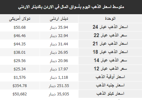 تعرف على اسعار الذهب لهذا اليوم Last updated يناير 6, 2020 Share وكالة الناس – أسعار معدن الذهب في الأردن اليوم الاثنين 6-1-2020 بالعملة الوطنية” الدينار الأردني” وأيضا الدولار الأمريكي. يشمل التقرير أسعار المعدن بجميع عياراته (عيار 24, 22, 18, 14, 12) في الاردن. كما ويتم متابعة أسعار الذهب اليوم في الأردن مرة كل (12) ساعة يوميا وذلك حسب توقيت العاصمة عمّان .